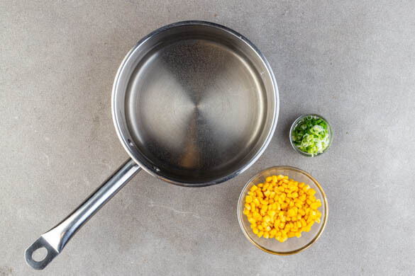 Einen großen Topf ca. 1cm hoch mit Wasser befüllen und das Wasser zum Kochen bringen. Die Lauchzwiebeln längs halbieren und quer in feine Streifen schneiden. Den Mais in ein Sieb abgießen und abtropfen lassen.