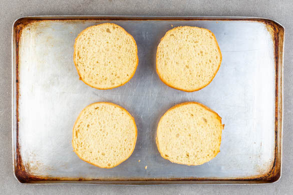Die Brötchen halbieren und mit der Schnittseite nach oben auf einem Backblech in 3–4Min. knusprig aufbacken.