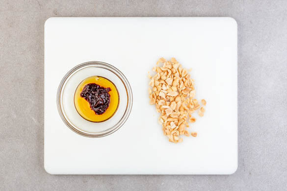 Das Sambal Badjak mit 1EL Honig verrühren. Die Erdnüsse grob hacken.
