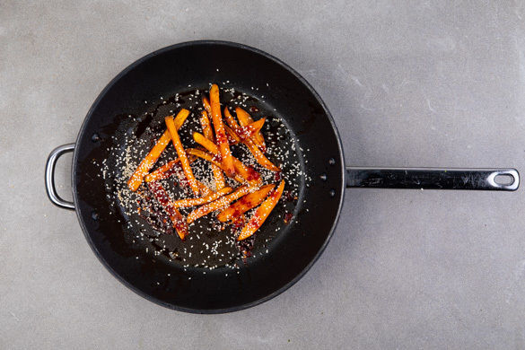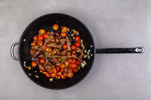 Die gerösteten Süßkartoffelpommes werden in einer pikant-süßen Sauce aus Honig und Sambal Badjak geschwenkt. Zur saftigen Wok-Pfanne mit zarten Steakstreifen vom Bio-Rind, fruchtigen Kirschtomaten und gerösteten Erdnüssen ergibt das ein echtes Dream-Team auf deinem Teller.