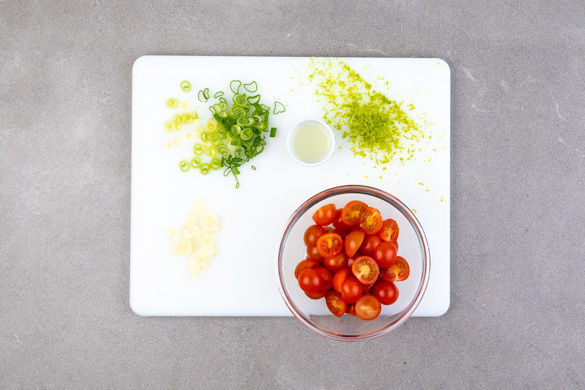 Die Kirschtomaten halbieren. Den Knoblauch schälen und in feine Scheibchen schneiden. Die Lauchzwiebeln in dünne Ringe schneiden. Die Limettenschale abreiben, dann die Limette halbieren und auspressen.
