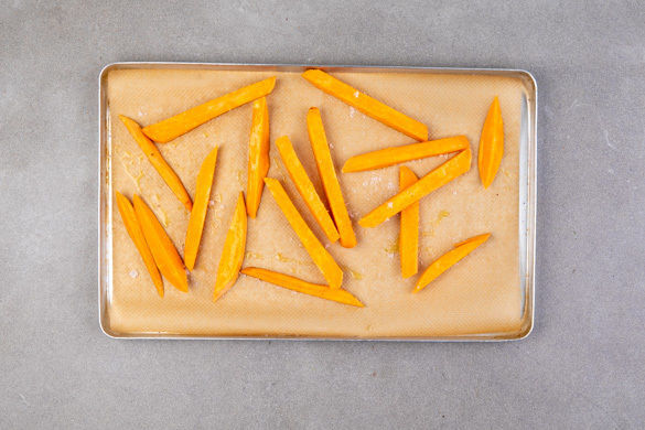 Den Backofen auf 240°C (220°C Umluft) vorheizen. Die Süßkartoffeln schälen und erst in ca. 1cm dünne Scheiben, dann in pommesartige Stifte schneiden. Auf einem mit Backpapier ausgelegten Backblech mit 2EL Pflanzenöl und 1 kräftigen Prise Salz vermengen und im Ofen 15–20Min. rösten.