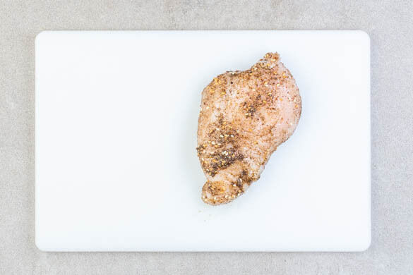 Den Backofen auf 220°C (200°C Umluft) vorheizen. In einem kleinen Topf 300ml ausreichend gesalzenes Wasser für den Bulgur zum Kochen bringen. Das Fleisch trocken tupfen und mit 1EL Olivenöl, der Gewürzmischung und je 1 Prise Salz und Pfeffer vermengen.