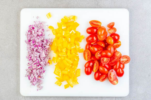 Die Kirschtomaten halbieren. Die Paprika vierteln, entkernen und in kleine Würfel schneiden. Die Zwiebel schälen, halbieren und fein würfeln.