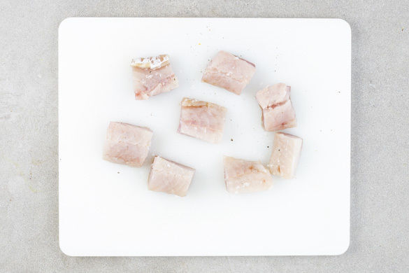 Den Fisch mit kaltem Wasser abspülen und trocken tupfen, dann in 2–3cm große Stücke schneiden. Evtl. vorhandene Gräten mit einer Pinzette entfernen. Die Fischstücke mit Salz und Pfeffer würzen.