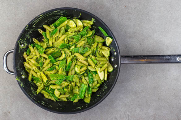 Die Pasta mit den Kaiserschoten und dem Pesto zu den Zucchini in die Pfanne geben, alles vermengen und 1–2Min. erwärmen.