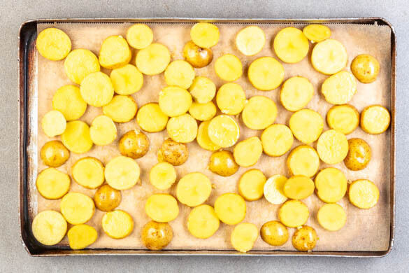 Den Backofen auf 200°C (180°C Umluft) vorheizen. Die Kartoffeln in ca. 0,5cm dicke Scheiben schneiden. Den Knoblauch schälen und durch eine Knoblauchpresse drücken oder sehr fein würfeln. Beides auf ein mit Backpapier ausgelegtes Backblech geben und mit 2EL Olivenöl und je ½TL Salz und Pfeffer vermengen. In 20–30Min. im Ofen goldbraun rösten. Nach der Hälfte der Zeit wenden.