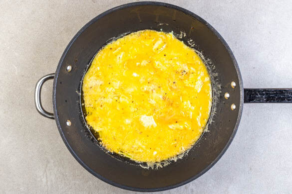 Die Pfanne auswischen. 1½TL Butter in der Pfanne bei niedriger Hitze schmelzen lassen. Die ½ der Eiermischung hineingießen, dabei die Pfanne leicht schwenken, um ein gleichmäßiges Omelett zu erhalten. Das Omelett abgedeckt 2–3Min. braten. Tipp: Die Oberseite sollte weich bleiben. Für ein festeres Omelett etwas länger braten.