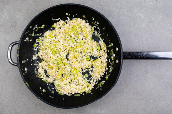 Den Lauch in einer großen Pfanne mit 1EL Olivenöl bei mittlerer Hitze 2–3Min. anbraten. Den Reis dazugeben und ca. 1Min. mitbraten, dann mit 100ml Brühe und 2EL Zitronensaft ablöschen und rühren, bis die Flüssigkeit aufgesogen ist.