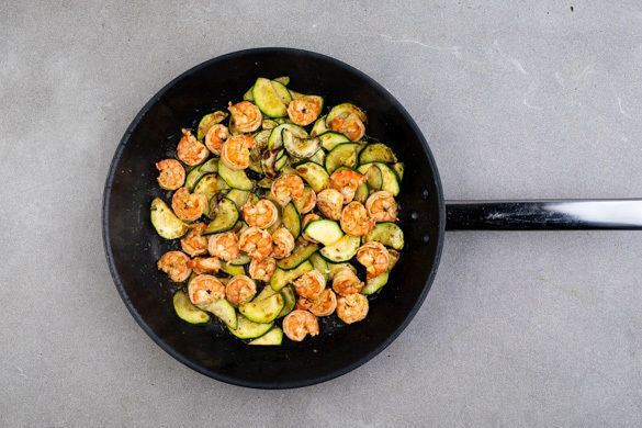 Die Zucchini längs halbieren und in dünne Scheiben schneiden. In derselben Pfanne mit 1EL Olivenöl bei mittlerer Hitze 4–5Min. von beiden Seiten anbraten. Die Zucchini mit je 1 kräftigen Prise Salz und Pfeffer würzen, dann die Garnelen zurück in die Pfanne geben und ca. 1Min. mitbraten.