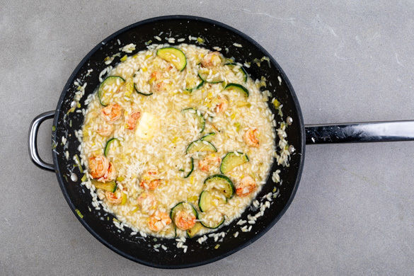Zitroniges Risotto mit Garnelen mit gebratener Zucchini und Lauch
