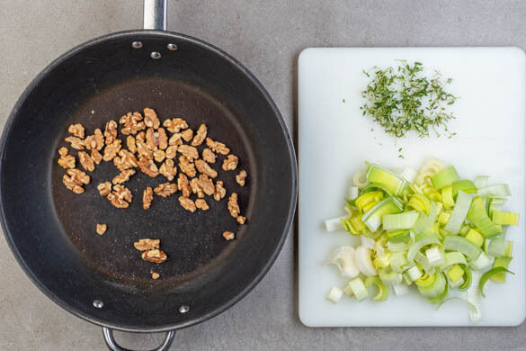 In einem mittelgroßen Topf ausreichend gesalzenes Wasser für die Pasta zum Kochen bringen. Die Walnusskerne grob hacken und in einer großen Pfanne ohne Zugabe von Fett bei mittlerer Hitze 1–2Min. anrösten. Vorsicht, sie können leicht verbrennen! Den Lauch längs halbieren und in ca. 1cm breite Scheiben schneiden. Den Thymian samt Stängeln grob schneiden.