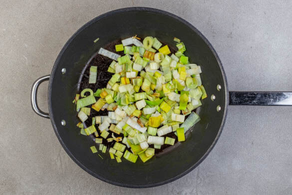 Den Lauch in der großen Pfanne mit 1EL Olivenöl und 1 Prise Salz bei mittlerer Hitze ca. 30Sek. anbraten. Die Hitze leicht reduzieren und den Lauch unter gelegentlichem Rühren in ca. 10Min. weich garen, dann auf niedrige Hitze reduzieren.