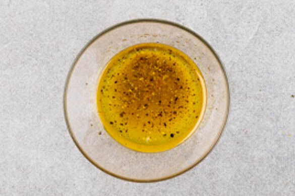Die Zitrone halbieren und eine Hälfte auspressen, die andere Hälfte in Spalten schneiden. 1EL Olivenöl und 1–2TL Zitronensaft mit je 1 Prise Salz und Pfeffer zu einem Dressing verrühren.