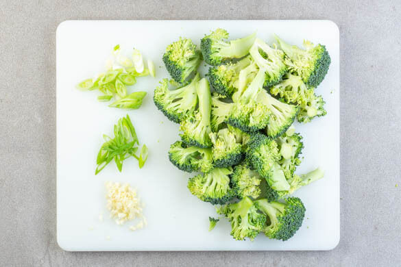 Den Brokkoli samt Strunk in ca. 2cm große Stücke schneiden. Den weißen Teil und den grünen Teil der Lauchzwiebeln getrennt in feine Ringe schneiden. Den Knoblauch schälen und sehr fein würfeln oder durch eine Knoblauchpresse drücken.