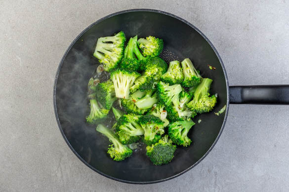 Die weißen Lauchzwiebelringe in einer großen Pfanne oder einem Wok mit 2EL Pflanzenöl bei mittlerer bis starker ca. 1Min. anbraten. Den Brokkoli hinzugeben und 3–4Min. mitbraten, bis er leichte Röstmarken bekommt, dann ca. 100ml Wasser angießen und weiter braten, bis das Wasser verdunstet ist.