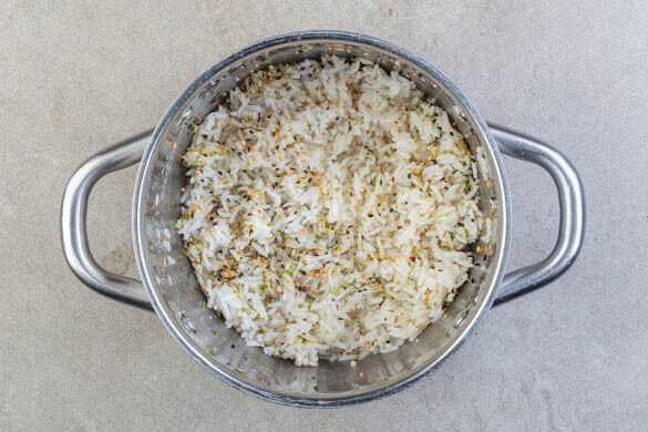 In einem mittelgroßen Topf 600ml leicht gesalzenes Wasser zum Kochen bringen. Den Reis in einem Sieb kalt abspülen, bis das Wasser klar bleibt. Sobald das Wasser kocht, den Reis hineingeben und abgedeckt bei niedrigster Hitze 10–12Min. kochen, bis das Wasser aufgesogen und der Reis gar ist. Noch ca. 5Min. ohne Hitzezufuhr ziehen lassen.