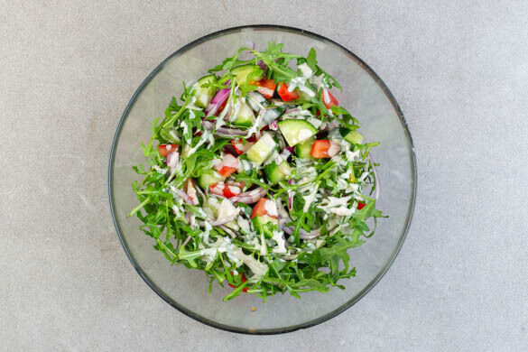 Die Gurken, die Zwiebeln und die Tomaten mit dem Rucola und der Tahinisauce vermengen.