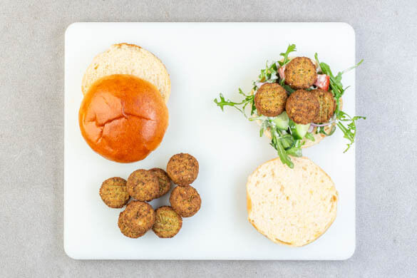 Die Brötchen halbieren und in den letzten 3–4Min. zu den Falafeln aufs Blech geben und knusprig aufbacken.