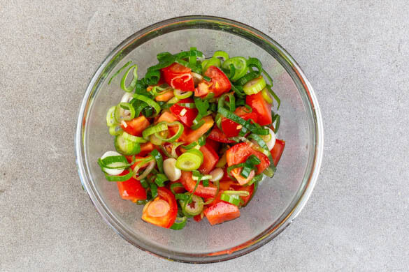 Die restlichen Tomaten und die Lauchzwiebeln mit 2TL hellem Essig und 1 Prise Salz vermengen und bis zum Servieren beiseitestellen.
