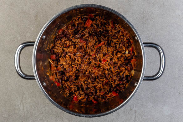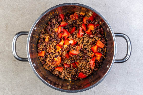 Das Hackfleisch in einem mittelgroßen Topf mit 1EL Olivenöl, der ½ der Gewürzmischung und 1 Prise Salz bei mittlerer bis starker Hitze 3–4Min. anbraten. Die Bohnen, die ½ der Tomaten, den Knoblauch, 1EL Ketchup und 2EL Wasser hinzugeben und das Chili abgedeckt 6–9Min. köcheln lassen.