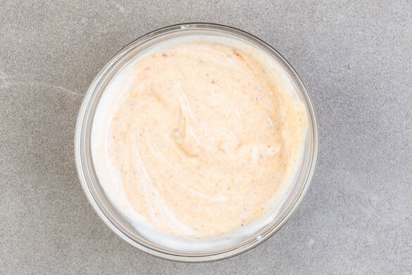 Die restliche Gewürzmischung mit dem Joghurt und je 1 Prise Salz und Pfeffer verrühren.