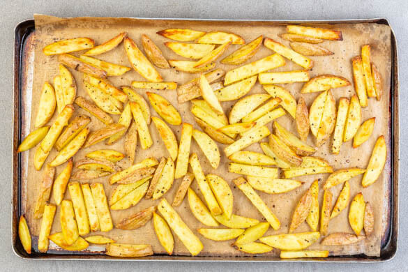Den Backofen auf 230°C (210°C Umluft) vorheizen. Die Kartoffeln samt Schale in breite, pommesartige Stifte schneiden. Auf einem mit Backpapier ausgelegten Backblech mit 2EL Pflanzenöl und ½TL Salz vermengen und 15–20Min. im Ofen backen, dann wenden und weitere ca. 10Min. backen, bis die Pommes knusprig und leicht gebräunt sind.