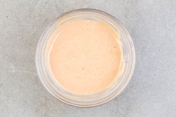 2EL Ketchup, 2EL Mayonnaise, 2TL Senf und 2TL Essig zu einer Sauce verrühren und mit je 1 Prise Salz und Pfeffer würzen.