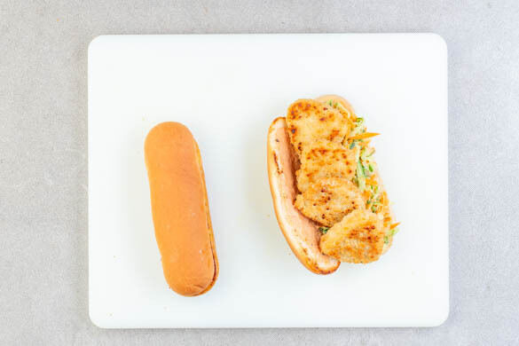 Die Brötchen im Ofen 2–4Min. aufbacken, dann längs aufschneiden. Die Brötchen mit den Fischnuggets, etwas Sauce und Slaw belegen und mit den Röstzwiebeln bestreuen. Die Sandwiches mit den Pommes und dem übrigen Slaw anrichten und mit der restlichen Sauce servieren.