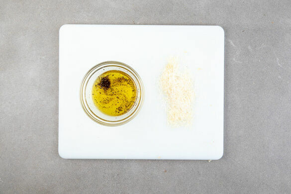 Aus 1EL Olivenöl, 1TL Essig und je 1 Prise Salz und Pfeffer ein Dressing anrühren. Den Käse fein reiben.