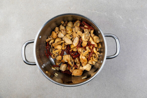 Das Fleisch mit etwas Küchenkrepp trocken tupfen, dann in einem großen Topf mit 2EL Olivenöl bei mittlerer Hitze 3–4Min. goldbraun anbraten. Die Pilze, die getrockneten Tomaten, die Oliven und den Knoblauch hinzugeben und 2–3Min. mitbraten.