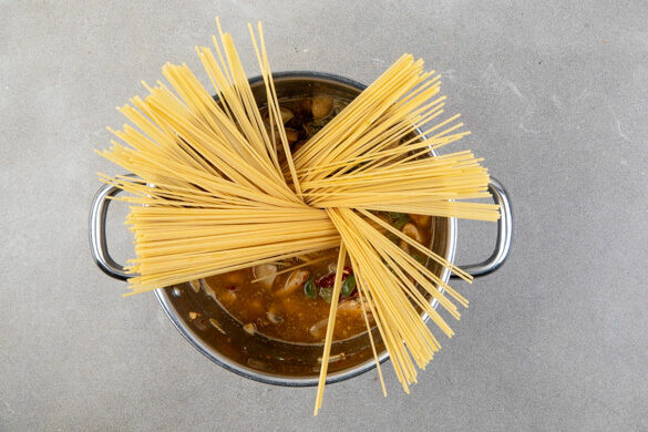2EL Mehl unterrühren und das Fleisch und das Gemüse mit 1,2L heißem Wasser ablöschen. Das Brühgewürz unterrühren und alles einmal aufkochen lassen, dann die Pasta dazugeben, gründlich umrühren und abgedeckt 10–15Min. köcheln lassen. Zwischendurch immer mal umrühren, damit nichts am Boden anbrennt, und nach Bedarf etwas mehr Wasser hinzugeben.