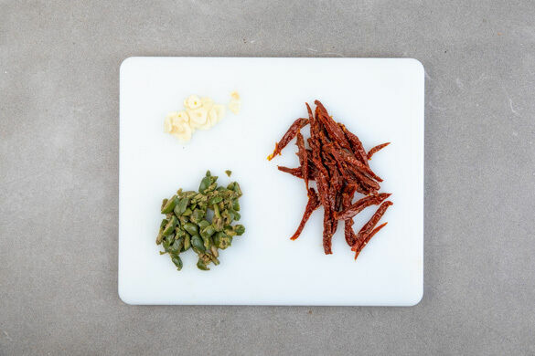 Die getrockneten Tomaten in feine Streifen schneiden. Die Oliven grob hacken. Den Knoblauch schälen und in feine Scheibchen schneiden.