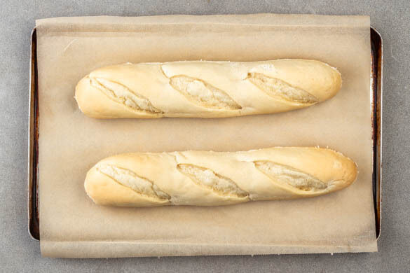 Den Backofen auf 220°C (200°C Umluft) vorheizen. Die Brötchen längs aufschneiden, aber nicht ganz durchschneiden, sodass Taschen entstehen, dann auf ein mit Backpapier ausgelegtes Backblech geben.
