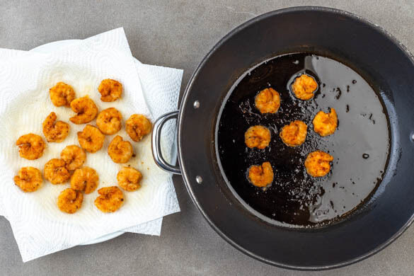 Die Brötchen im Ofen in ca. 4Min. knusprig und goldbraun backen. Währenddessen in einer mittelgroßen Pfanne 2EL Pflanzenöl bei mittlerer bis starker Hitze erwärmen. Die Garnelen in das heiße Öl geben und auf jeder Seite in 1–2Min. goldbraun braten. Auf etwas Küchenpapier abtropfen lassen.