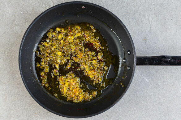 In der Pfanne 3–4EL Butter bei mittlerer Hitze schmelzen lassen und die Schalotten ca. 1Min. glasig anschwitzen. 1TL Zucker und 1 Prise Salz unterrühren und ca. 30Sek. mitbraten, dann mit 2–3EL (hellem) Essig und dem Safranwasser ablöschen und die Flüssigkeit 2–3Min. bei niedriger Hitze unter Rühren reduzieren. Die Safranbutter in eine kleine Schüssel geben. Die Pfanne auswischen.