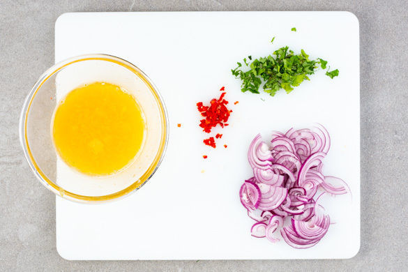 Die Korianderblätter abzupfen und fein schneiden. Die Zwiebeln schälen, halbieren und in feine Streifen schneiden. Die Peperoni längs halbieren und in feine Würfel schneiden. Tipp: Für weniger Schärfe die Kerne entfernen. Die Limetten und die Orangen halbieren, auspressen und den Saft mit den Zwiebeln, der Peperoni und 1 Prise Salz verrühren.