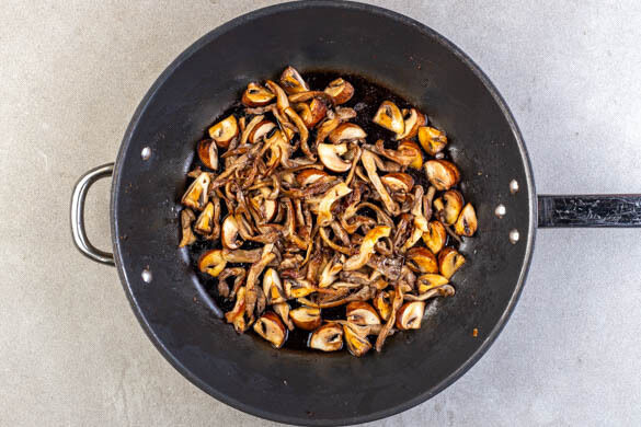 In derselben Pfanne die Champignons mit 1TL Olivenöl bei mittlerer bis starker Hitze 4–5Min. braten, bis sie gebräunt sind und die meiste Feuchtigkeit verdunstet ist. Vom Herd nehmen und die Austernpilze unterrühren. Mit je 1 Prise Salz und Pfeffer würzen und bis zum Servieren warmhalten.