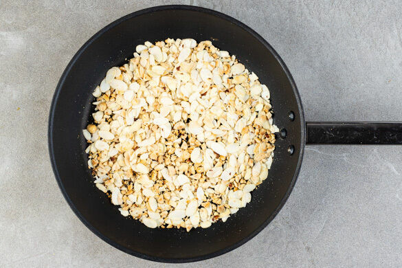Den Backofen auf 200°C Umluft (220°C Ober-/Unterhitze) vorheizen. Die Haselnüsse fein hacken und mit den Mandeln in einer mittelgroßen Pfanne ohne Zugabe von Fett bei mittlerer Hitze 1–2Min. goldbraun anrösten, dabei regelmäßig rühren. Vorsicht, dass die Nüsse und Mandeln nicht zu dunkel werden. Zum Abkühlen aus der Pfanne nehmen, die Pfanne aufbewahren.