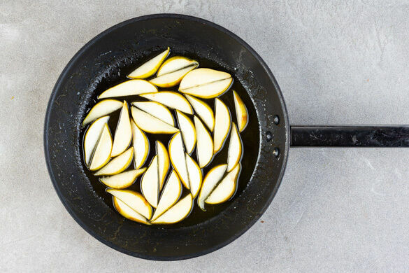 Inzwischen die Birnen halbieren, entkernen und in ca. 1cm dünne Spalten schneiden. 2TL Honig in der Pfanne bei starker Hitze leicht karamellisieren lassen, dann die Birnen dazugeben und 1–2Min. bei mittlerer Hitze im Honig schwenken. Die Birnen sollen nicht zu stark garen, sondern noch bissfest bleiben.