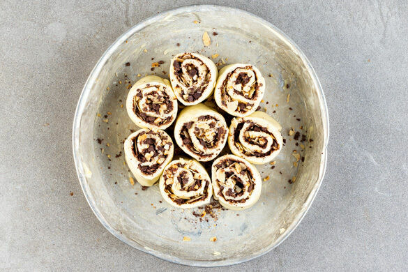 Die Teigrollen so hinlegen, dass die Nahtstelle nach unten zeigt, dann jeweils in 8 Stücke schneiden. Eine weite Auflaufform mit 2TL Butter fetten. Die Teigröllchen mit der Schnittfläche nach oben nebeneinander in die Auflaufform setzen und die Schnecken 20–25Min. im Ofen goldbraun backen.