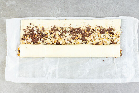 Die Teige mit dem Papier nach unten ausrollen und je nach Geschmack mit 1–2EL Zucker, der Mandel-Nuss-Mischung und der Schokolade gleichmäßig bestreuen, dabei an einer Längsseite einen ca. 2cm breiten Rand frei lassen. Die Teige zum freien Rand hin vorsichtig und eng aufrollen und gut verschließen.