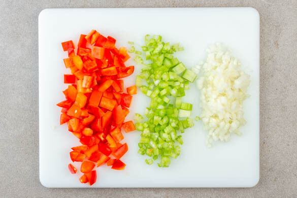 Die Zwiebel schälen, halbieren und fein würfeln. Den Sellerie fein würfeln. Die Paprika vierteln, entkernen und in kleine Würfel schneiden.