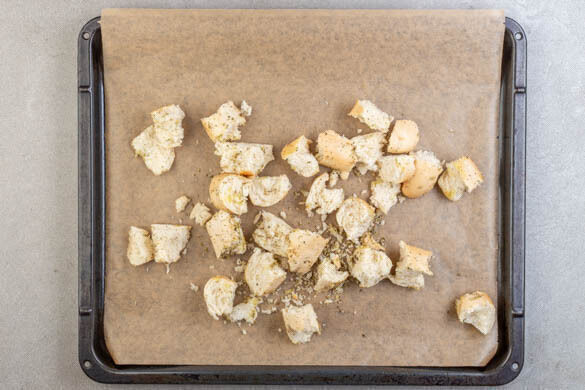 1½ Brötchen längs halbieren, dann in ca. 2cm dicke Croûtons schneiden oder zupfen. Auf einem mit Backpapier ausgelegten Backblech mit 3EL Olivenöl, 1½TL getrocknetem Oregano und je 1 kräftigen Prise Salz und Pfeffer vermengen und 8–10Min. im Ofen backen, bis die Croûtons goldbraun und knusprig sind. Dann abkühlen lassen.