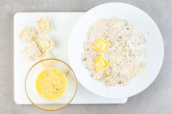 1 Ei mit 1EL Wasser verquirlen. Auf einem tiefen Teller das Panko-Paniermehl mit 2TL Mehl, der ½ der Gewürzmischung und der ½ des Käses vermengen. Die Tortelli einzeln im Ei wenden, kurz abtropfen lassen und anschließend im Panko-Mix panieren.