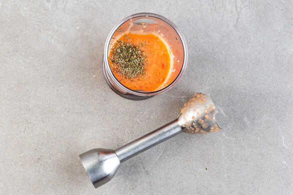 Inzwischen die Tomaten vierteln. Den Knoblauch schälen und mit den Tomaten, 2EL Olivenöl, 1TL Zucker und ½TL Salz in einem hohen Gefäß pürieren. Die restliche Gewürzmischung unterrühren und die Sauce mit Salz und Pfeffer abschmecken.