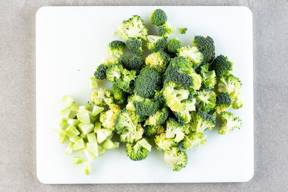 Den Backofen auf 220°C (200°C Umluft) vorheizen. Die Brokkoliröschen in mundgerechte Stücke schneiden, den Strunk ggf. schälen und in kleine Würfel schneiden.