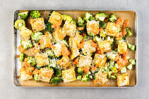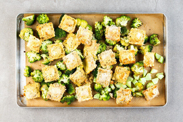Was ist das Schöne an Tortelli? Natürlich das Reinschauen! Und genau das machen wir heute noch ein bisschen spannender: Sie werden zuerst mit einer fein-würzigen Käse-Panko-Panade ummantelt, bevor sie im Ofen so richtig schön knusprig werden dürfen. Ebenfalls mit Röstaroma präsentiert sich ganz unverblümt der Brokkoli. All diesen Köstlichkeiten stellst du passend eine selbst gemachte Tomatensauce zur Seite. Zu Tisch!