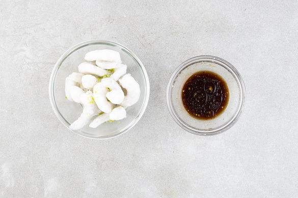 Die Limettenschale abreiben, dann die Limette halbieren und auspressen. Die Garnelen mit kaltem Wasser abspülen, trocken tupfen und in einer kleinen Schüssel mit 1TL Limettenschale, 2TL Pflanzenöl sowie je 1 Prise Salz und Pfeffer vermengen. Den Limettensaft, 1EL Sojasauce, das Sesamöl, 1TL Pflanzenöl, ½TL Zucker sowie Salz und Pfeffer zu einem Dressing verrühren.