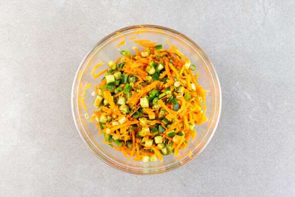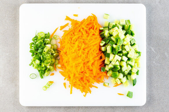 Die Karotte ggf. schälen und mit einer Küchenreibe grob raspeln. Die Gurke längs vierteln und in ca. 0,5cm kleine Stücke schneiden. Die Lauchzwiebel schräg in feine Ringe schneiden.
